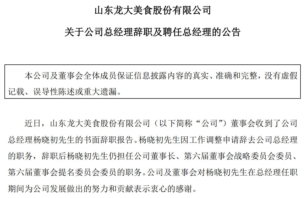 春节刚过就出现高管变动,龙大美食的公告自然受到关注。