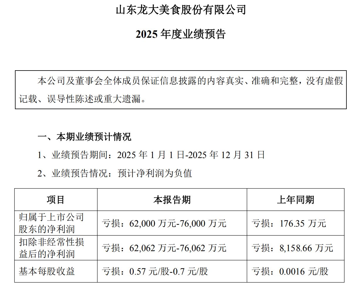 不过,龙大美食业绩仍面临挑战。根据之前发布的业绩预告,2025年,龙大美食预计归母净利润亏损6.2亿元至7.6亿元。
