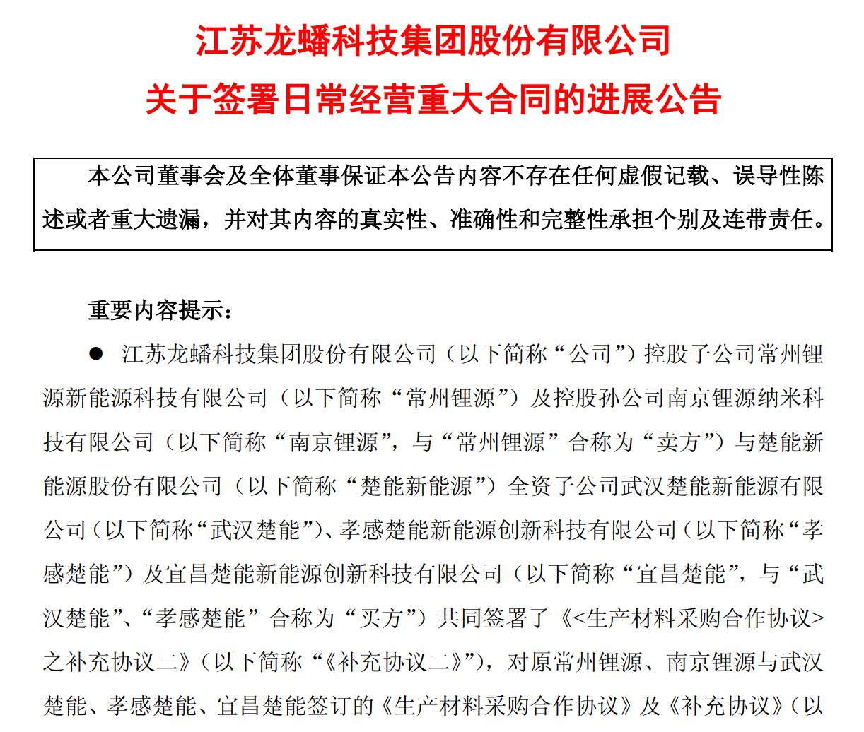 11月24日晚间,龙蟠科技(603906.SH,股价16.42元,市值112.49亿元)公告称,公司控股子公司常州锂源及控股孙公司南京锂源(以下简称“卖方”)与楚能新能源全资子公司武汉楚能、孝感楚能及宜昌楚能(以下简称为“买方”)共同签署了《补充协议二》,对原协议相关条款进行补充与修订。