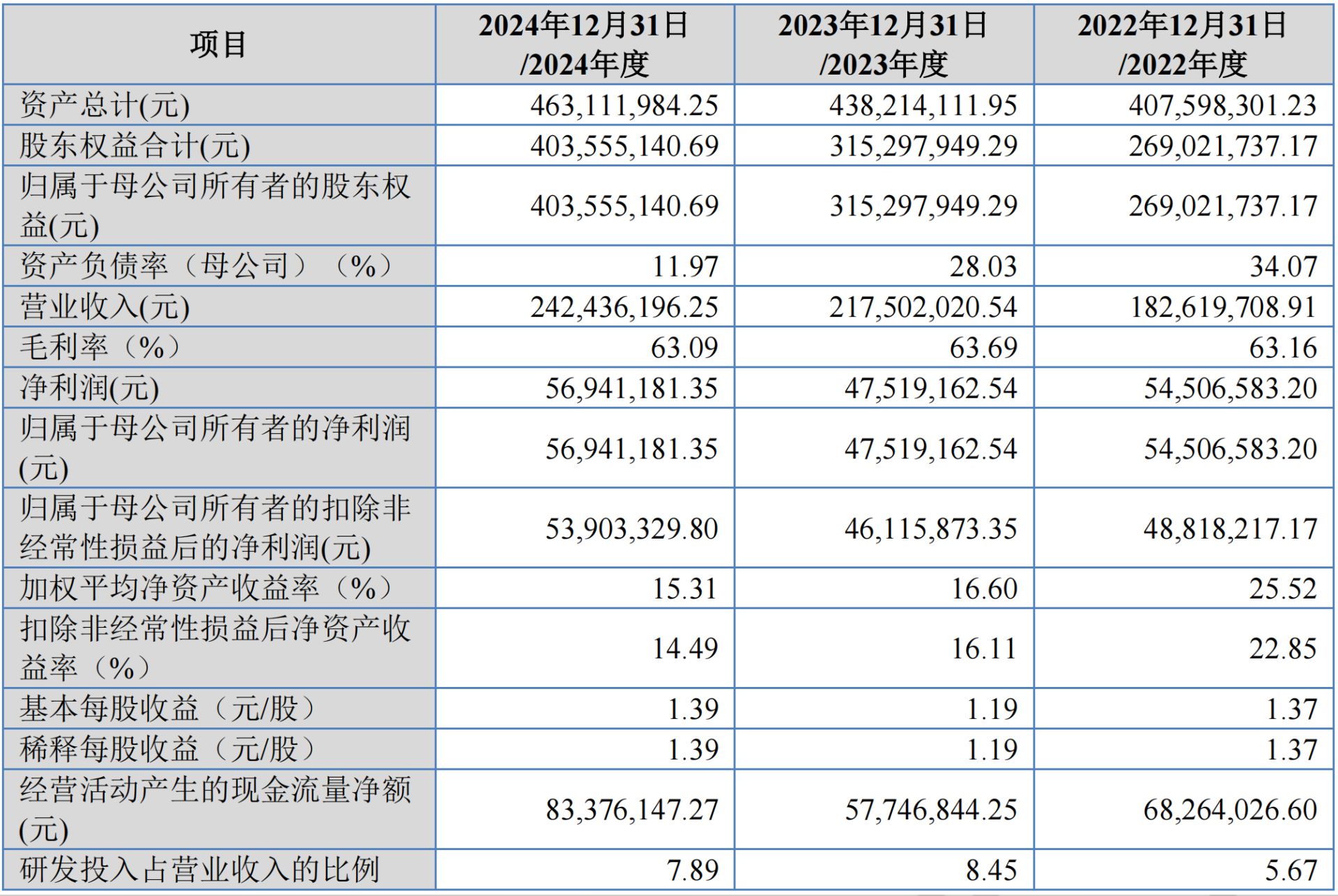 多家机构纷纷入股,珈凯生物的业绩表现究竟如何呢?2022年至2024年(以下简称“报告期内”),公司营收分别为1.83亿元、2.18亿元和2.42亿元,归母净利润分别为5451万元、4752万元和5694万元。