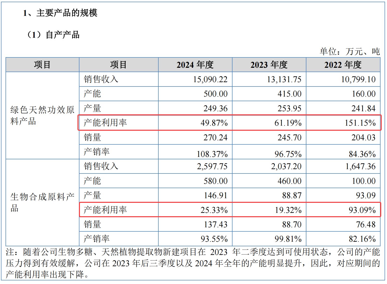 从产能利用率来看,报告期内,珈凯生物的主要产品——绿色天然功效原料的产能利用率从151.15%降至61.19%,进而降至49.87%;生物合成功效原料的产能利用率也从93.09%分别降至19.32%和25.33%。
