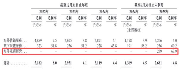米多多业务分为三大板块:海外营销服务、数字展览服务以及海外电商运营。其中,海外营销服务是公司最核心的业务,2022年、2023年、2024年和2025年上半年(下称“报告期内”)该业务的收入占比分别为99%、99.3%、99.3%和98.7%。