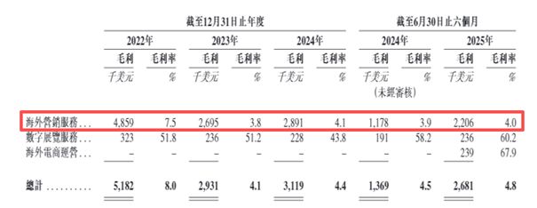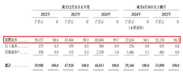 报告期内,米多多的整体毛利率分别为8%、4.1%、4.4%和4.8%。其中,核心“海外营销服务”的毛利率在2023年一度跌至3.8%,2025年上半年回升至4%。个位数的毛利率,源于米多多高度依赖向上游媒体平台采购流量。招股书显示,公司的销售成本主要由媒体成本构成。报告期内,媒体成本占总销售成本的比例分别高达98.6%、99.3%、95.7%和98.3%。