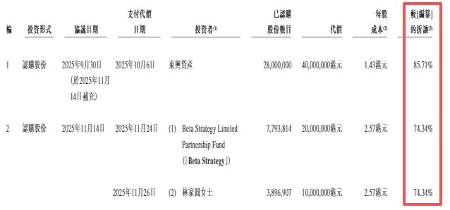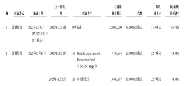 其中,东兴证券(香港)资产管理有限公司(下称“东兴资管”,东兴证券的间接全资附属公司)作为第一轮投资者,以4000万港元认购了2800万股,每股成本约1.43港元。第二轮融资则引入了Beta Strategy和个人投资者林家圆,前者以2000万港元认购了约779万股,林家圆则以1000万港元认购了约390万股。