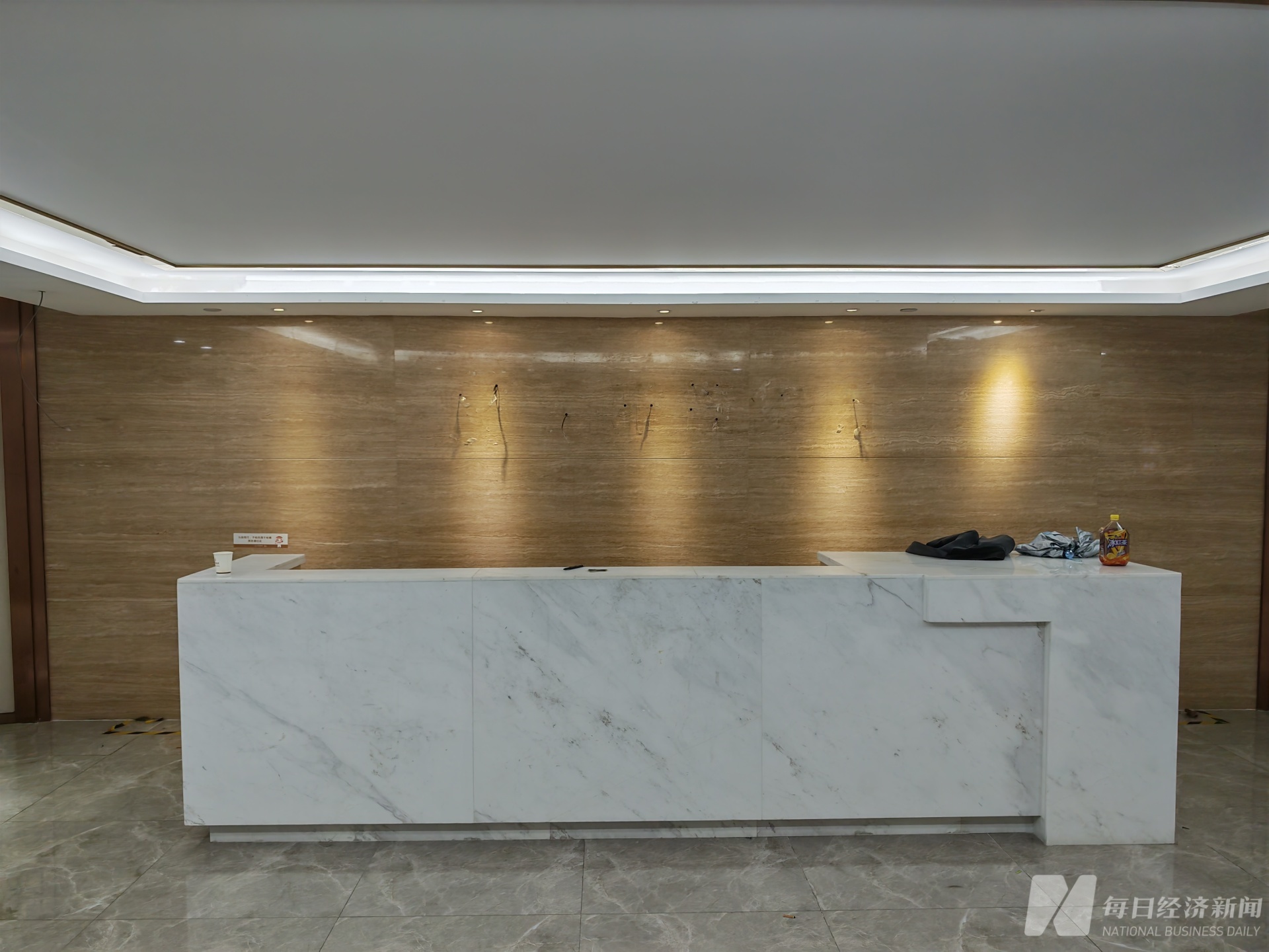12月17日晚,金雅福总部办公室前台,公司名称字样已摘下。图片来源:每经记者 孔泽思 摄