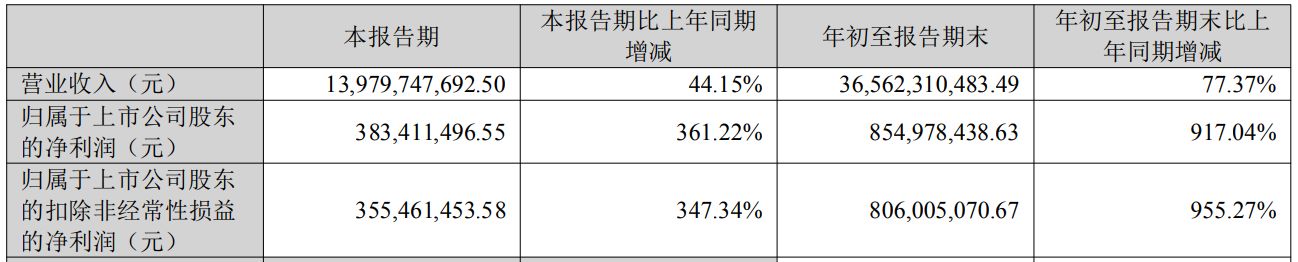 万辰集团2025年第三季度报告显示,2025年前三季度,公司实现营业收入365.62亿元,同比增长77.37%;归属于上市公司股东的净利润8.55亿元,同比增长917.04%。