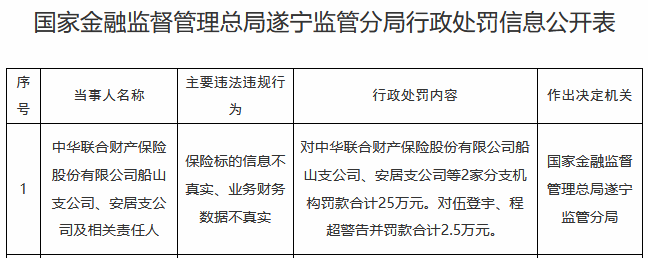中华联合财险2家支公司被罚 涉保险标的信息不真实等