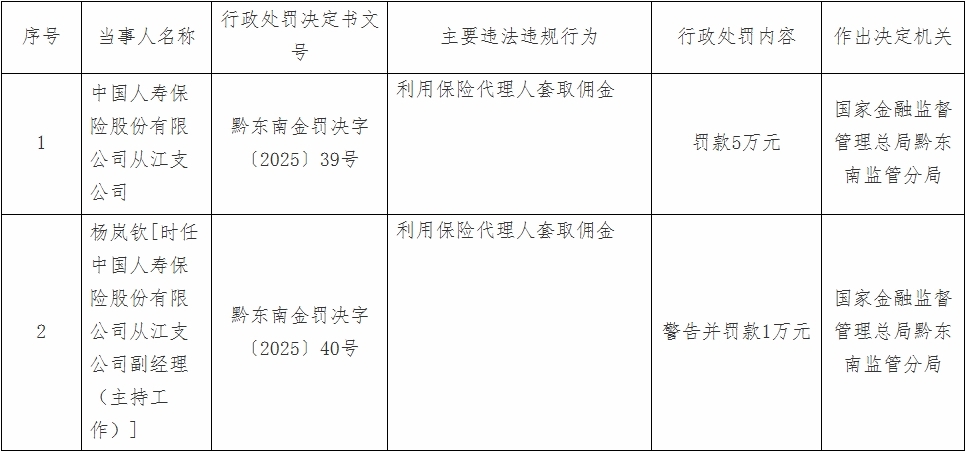 国家金融监督管理总局黔东南监管分局依据相关法律法规,对中国人寿保险股份有限公司从江支公司罚款5万元;对杨岚钦警告并罚款1万元。