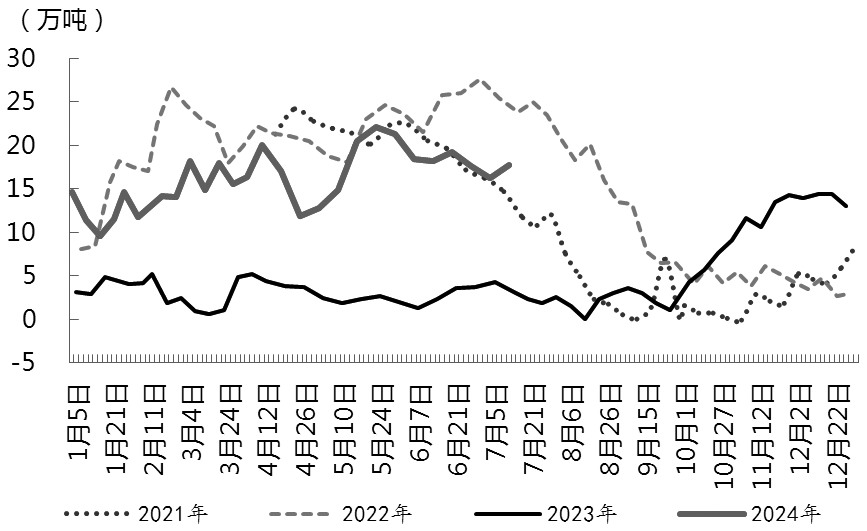 2024年国内菜籽到港量始终维持近年历史高位,三季度也将延续该格局。从供应端来看,国家粮油信息中心船期监测显示,三季度进口菜籽预计维持月均47万吨左右,菜籽周均开机率维持在40%以上。整体上,预计7—9月国内进口菜粕(含进口菜籽压榨)新增供给量在155万吨左右。从需求端来看,二三季度处于水产养殖旺季,菜粕需求处在季节性高峰,不过今年下游水产端需求较往年有所下降,1—5月水产饲料产量大幅减少,加上南方地区阶段性暴雨导致投苗延迟,进一步抑制菜粕需求,预计后市库存仍存在增加空间。