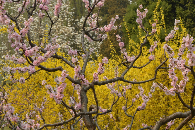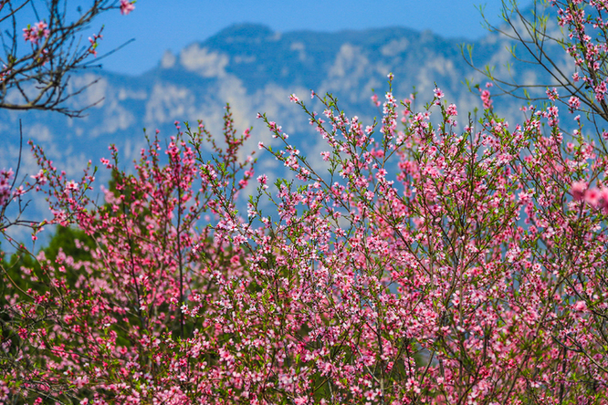 春景正盛,景区里漫山遍野的桃花、杏花、迎春花竞相开放、争奇斗艳,呈现出“百花开放春满园”的盛景。粉色的桃花开满山坡,璀璨夺目,分外妖娆;淡雅的杏花,洁白如霜,充满生机活力;还有金灿灿的迎春花点缀其中,多种色彩互相辉映,充满了春天的浪漫与希望。