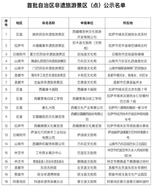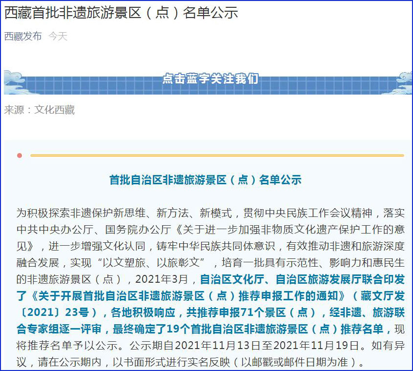 据西藏发布微信公众号消息,为有效推动非遗和旅游深度融合发展,实现“以文塑旅、以旅彰文”,培育一批具有示范性、影响力和惠民生的非遗旅游景区(点),2021年3月,西藏自治区文化厅、自治区旅游发展厅联合印发了《关于开展首批自治区非遗旅游景区(点)推荐申报工作的通知》(藏文厅发〔2021〕23号),各地积极响应,共推荐申报71个景区(点),经非遗、旅游联合专家组逐一评审,最终确定了19个首批自治区非遗旅游景区(点)推荐名单。公示期自2021年11月13日至2021年11月19日。如有异议,请在公示期内,以书面形式进行实名反映(以邮戳或邮件日期为准)。