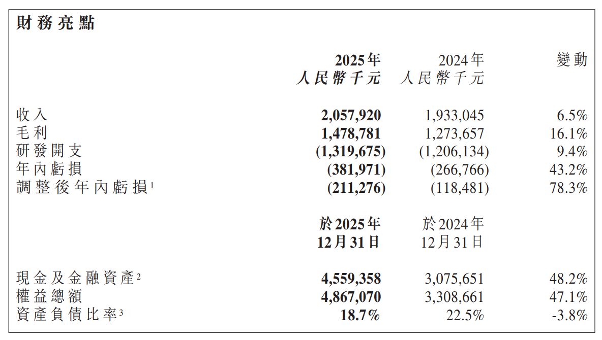 研发投入的增加是导致年内亏损扩大的主要原因——2025年公司净亏损3.82亿元,较2024年的2.67亿元增加43.2%;调整后净亏损为2.11亿元,同比扩大78.3%。不过,公司的财务状况整体稳健。截至2025年末,现金及金融资产达45.59亿元,同比增长48.2%;资产负债比率降至18.7%,较2024年下降3.8个百分点。