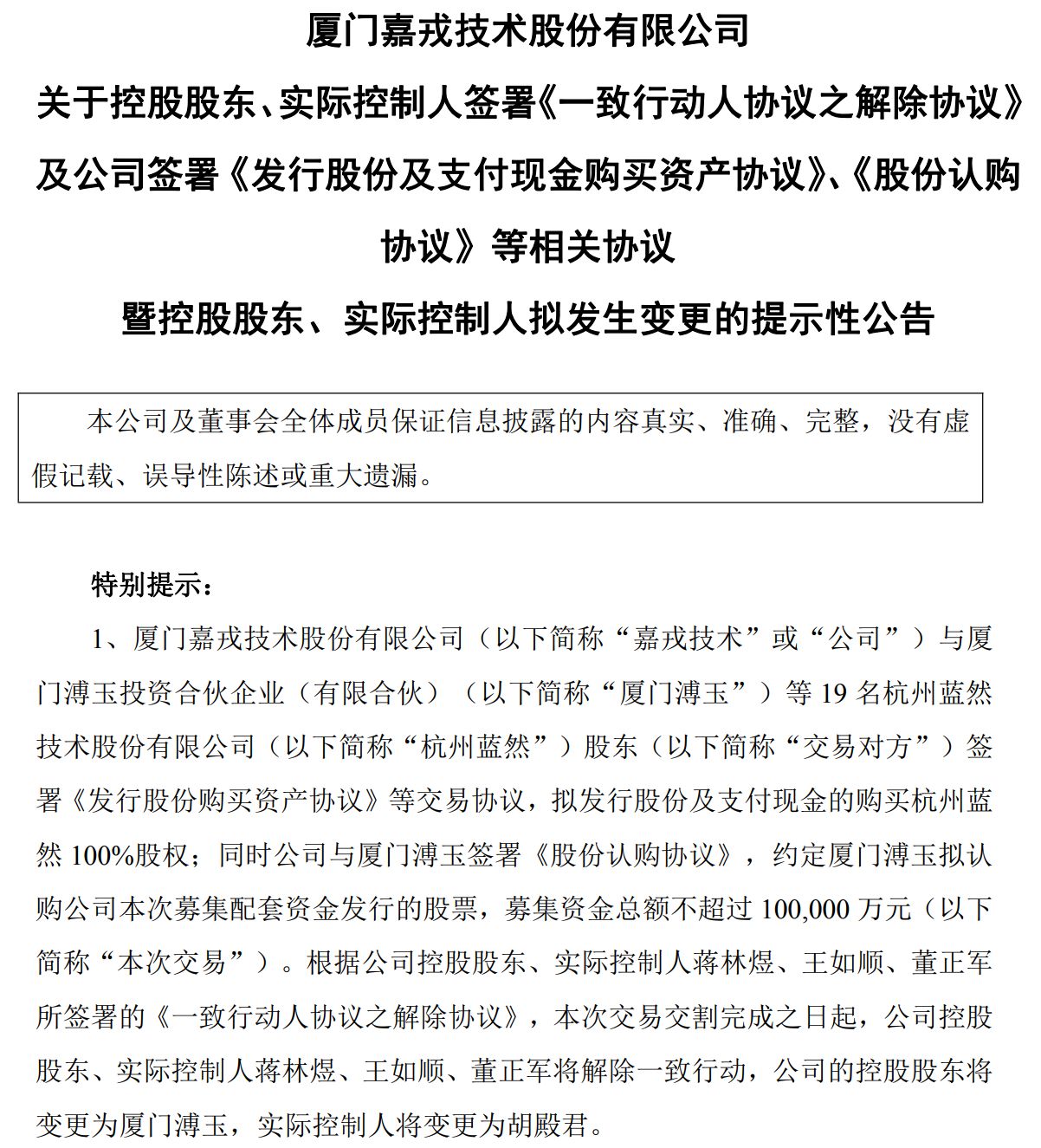 嘉戎技术拟通过发行股份及支付现金的方式,购买杭州蓝然技术股份有限公司(以下简称“杭州蓝然”)100%股权,并拟向厦门溥玉投资合伙企业(有限合伙)(以下简称“厦门溥玉”)发行股份募集配套资金不超过10亿元。