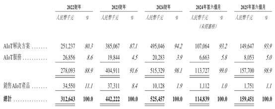 2022年至2024年各年度及2025年上半年(下简称报告期)内,德风新征程主要业务为AIoT解决方案(向客户提供跨行业及行业特定的AIoT解决方案)、提供AIoT服务(向客户提供维护及技术支持服务)和销售AIoT产品。其中,AIoT解决方案在总收入中占比最高,报告期内均在80%以上。