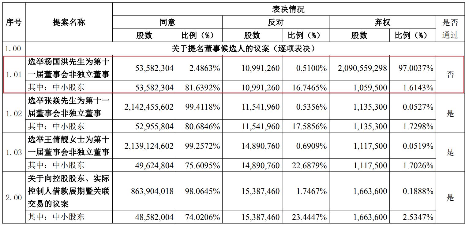 不过,杨国洪未能当选并非源于反对票,而是有超20亿的票选择了弃权。能够投出如此多弃权票的,只有公司控股股东及其一致行动人。