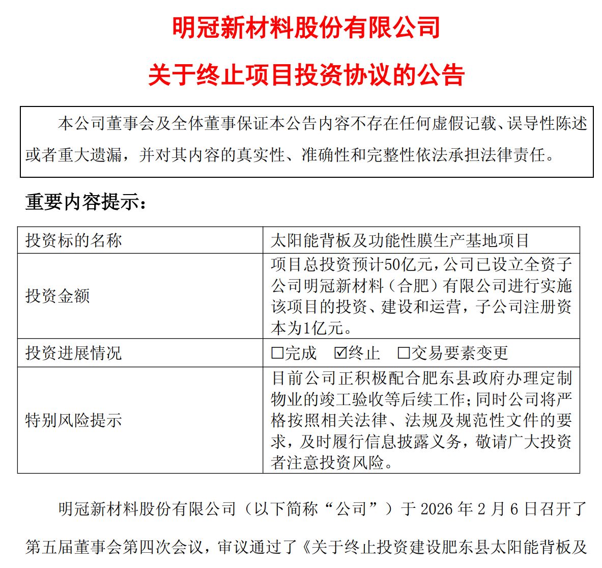 然而,三年后的2026年2月6日,明冠新材召开董事会,审议通过了终止上述合肥项目的议案。