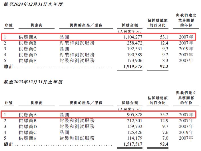 采购明细数据显示,“供应商A”的晶圆代工厂在圣邦股份的供应链体系中占据了首要地位。2023年,圣邦股份向“供应商A”的采购金额为9.06亿元,占当年公司总采购额的比例达到55.2%。2024年,圣邦股份向“供应商A”的采购规模进一步扩大至11.04亿元,采购占比依然维持在53.1%的高位。
