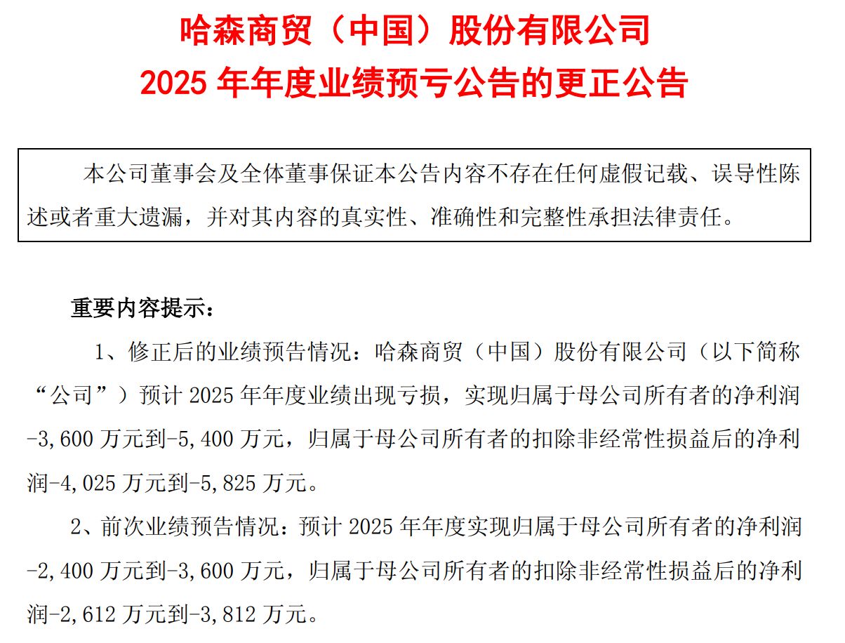 4月2日晚间,哈森股份(SH603958,股价20.05元,市值43.98亿元)就2025年年度业绩预亏公告进行了更正,将此前预计的年度亏损区间从2400万元至3600万元下修至3600万元至5400万元。