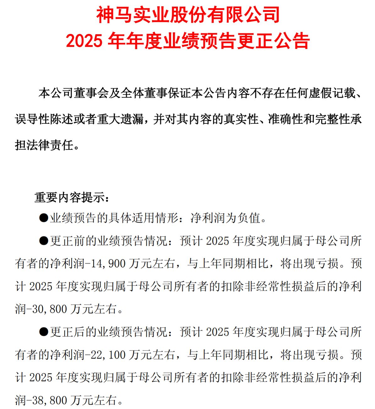 就在前一日(4月1日)晚间,神马股份(SH600810,股价8.21元,市值91.24亿元)也发布《2025年年度业绩预告更正公告》,将2025年的预计净亏损从1.49亿元扩大至2.21亿元,二者相差7200万元。