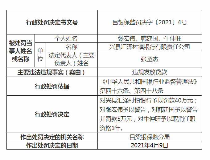 根据公告,兴县汇泽村镇银行因违规发放贷款,依据《中华人民共和国银行业监督管理法》第四十六条、第四十八条,吕梁银保监分局对兴县汇泽村镇银行予以罚款40万元;对张宏伟予以警告,对韩建国予以警告并罚款5万元,对牛仲旺予以取消任职资格1年。