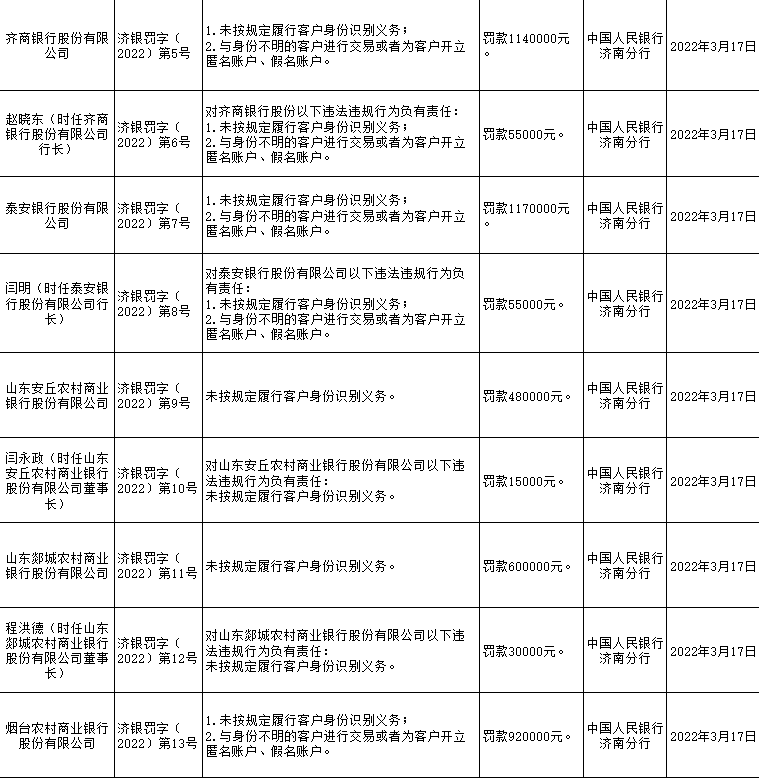 3月23日,中国人民银行官网更新行政处罚公告显示,齐商银行、泰安银行、山东安丘农村商业银行、山东郯城农村商业银行、烟台农村商业银行、临商银行合计被罚款448万元。