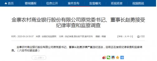 9月24日,安徽纪检监察网披露,金寨农村商业银行股份有限公司原党委书记、董事长赵勇涉嫌严重违纪违法,目前正在接受纪律审查和监察调查。