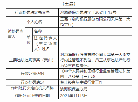 原标题:快讯|对员工从事违法活动负有直接责任渤海银行天津第一大街支行王磊被罚终身禁业
