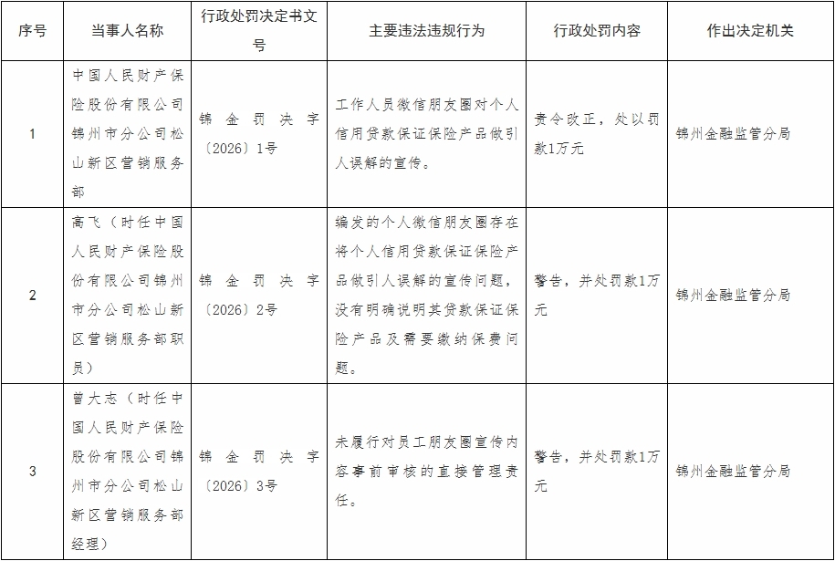 中国经济网北京3月10日讯 国家金融监督管理总局网站昨日披露的锦州金融监管分局行政处罚信息公示列表(锦金罚决字〔2026〕1号-3号)显示,中国人民财产保险股份有限公司锦州市分公司松山新区营销服务部工作人员微信朋友圈对个人信用贷款保证保险产品做引人误解的宣传。