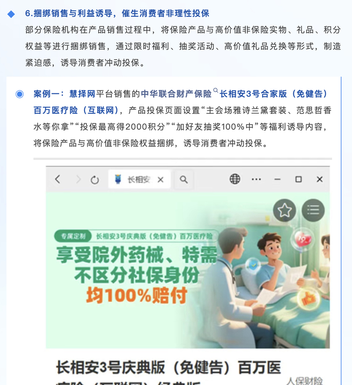 该《报告》所举典型案例为:慧择网平台销售的中华联合财产保险长相安3号合家版(免健告)百万医疗险(互联网),产品投保页面设置“主会场雅诗兰黛套装、范思哲香水等你拿”“投保最高得2000积分”“加好友抽奖100%中”等福利诱导内容,将保险产品与高价值非保险权益捆绑,诱导消费者冲动投保。