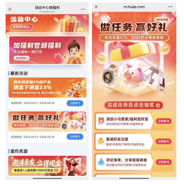 尽管《报告》发布已有近一个月,登录慧择保险网App后发现,平台内仍有“做任务,赢好礼”“邀请亲友,立得现金”等活动。其中,“做任务,赢好礼”活动显示,奖品包含华为手表、8888积分等,任务包括邀请好友注册、评论保单等4项,每完成一项任务即可获得一次抽奖机会,活动时间为4月1日至4月30日。