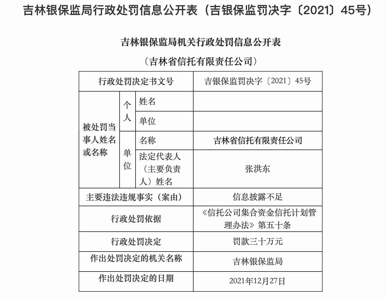 2022年1月5日,吉林银保监局公开行政处罚信息,吉林省信托有限责任公司(下称“吉林信托“)因信息披露不足,被罚款30万元。吉林信托李某和于某因对吉林信托信息披露不足负直接责任被警告。