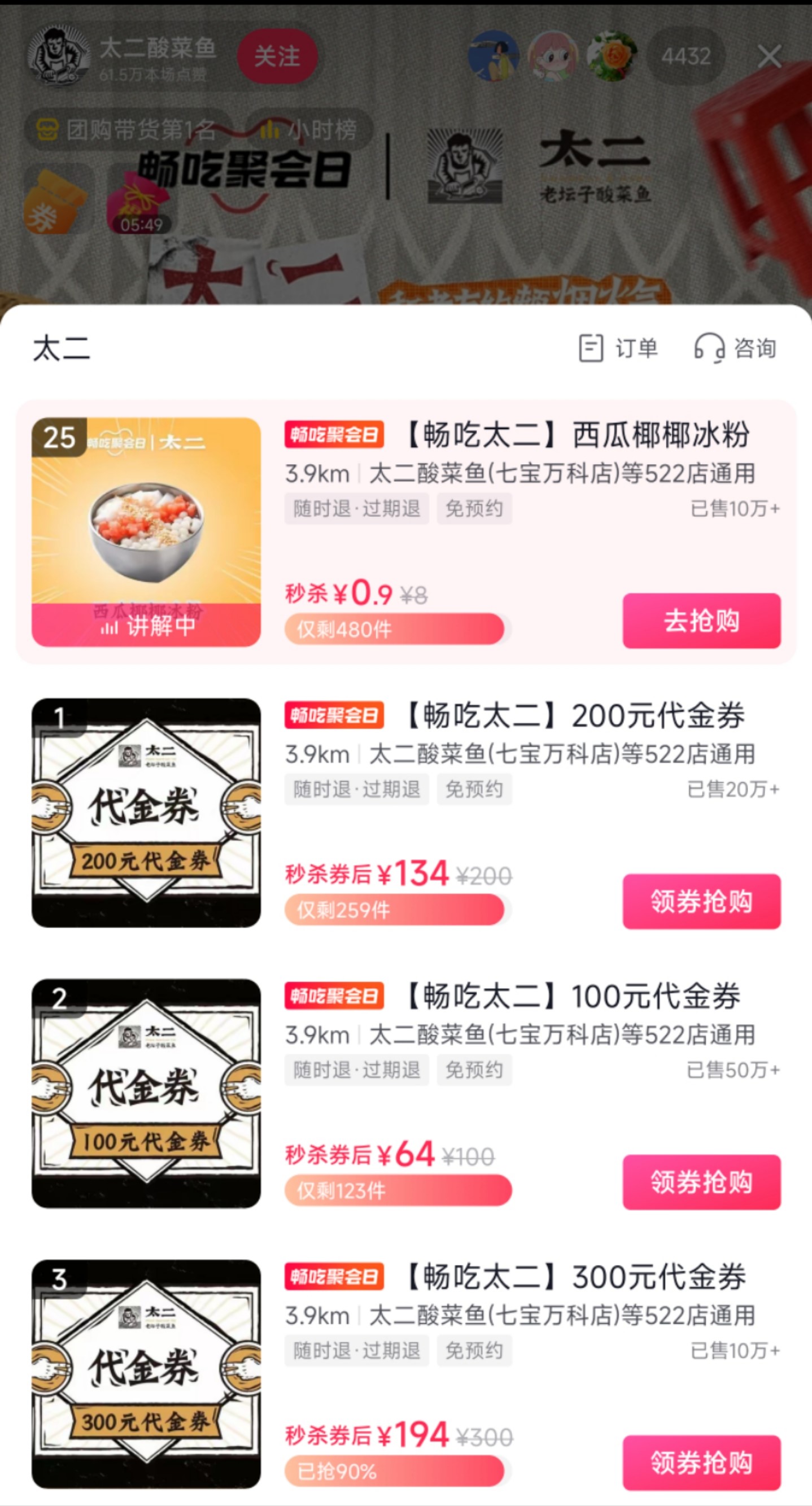 根据红餐网数据,太二酸菜鱼此次抖音直播开播不到6小时,销售额已经破亿元,并登上抖音团购带货榜第1名。新消费日报记者查询发现,截至下午5点,太二直播间已有6件商品销量破10万,其中69代100元代金券已卖出50万张。