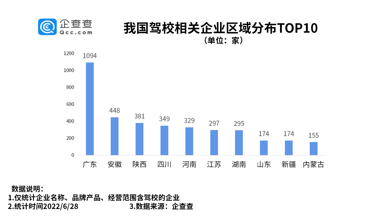 企查查数据显示,从区域分布来看,广东以1094家驾校相关企业排名第一。安徽、陕西分别有驾校相关企业448家、381家,位居前三。此后依次为四川、河南、江苏、湖南等省份。