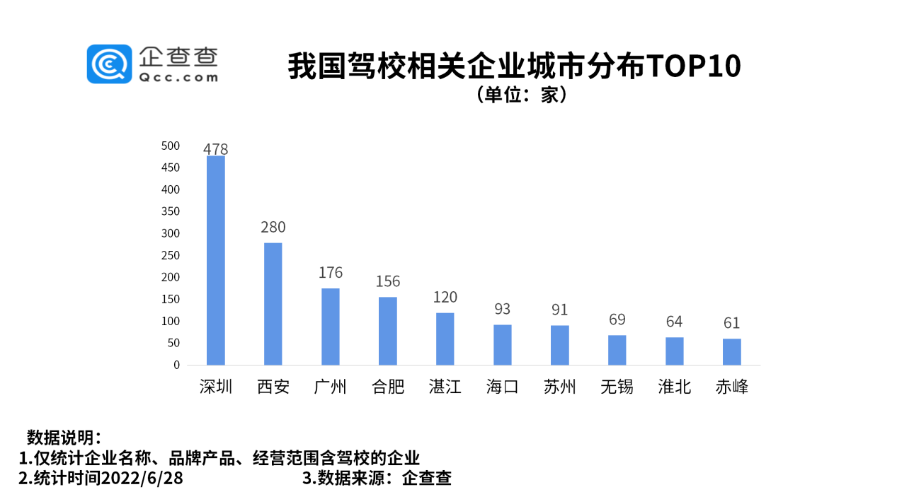 企查查数据显示,从城市分布来看,深圳以478家驾校相关企业排名第一。西安、广州分别有驾校相关企业280家、176家,排名前三。此后依次为合肥、湛江、海口、苏州等城市。