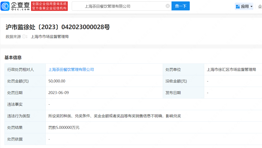 企查查APP显示,近日,乐乐茶关联公司上海茶田餐饮管理有限公司因有奖销售信息不明确,影响兑奖,被上海市徐汇区市场监督管理局罚款5万元。处罚事由显示,此前,当事人通过微信公众号及小程序、小红书等平台宣传参与购买酷兒联名奶茶送多功能杯塞、杯垫的活动,但当事人在有奖销售前未明确公布奖品数量等信息,违反《规范促销行为暂行规定》。
