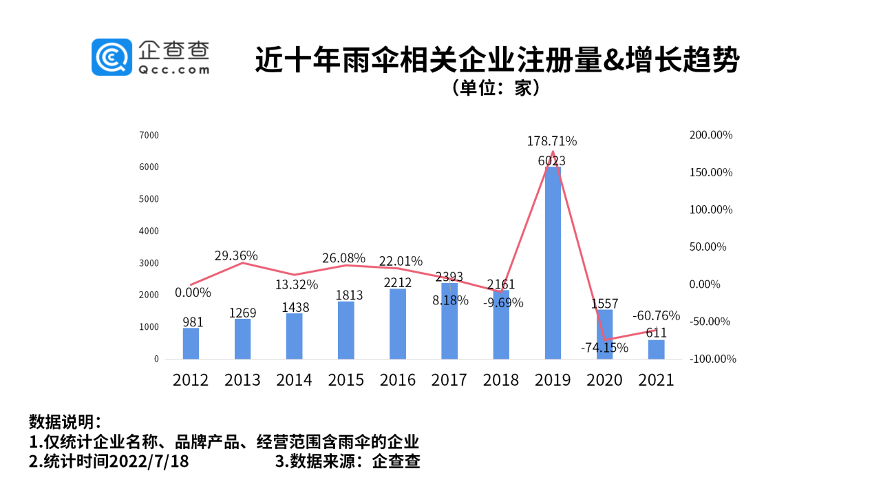 1、2019年新增雨伞相关企业6023家,为近10年最多