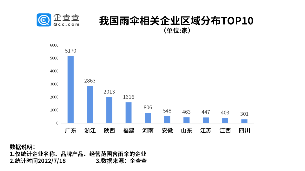 企查查数据显示,从区域分布来看,广东以5170家雨伞相关企业排名第一。浙江、陕西分别有2863家、2013家雨伞相关企业,位居前三。此后依次为福建、河南、安徽等省份。