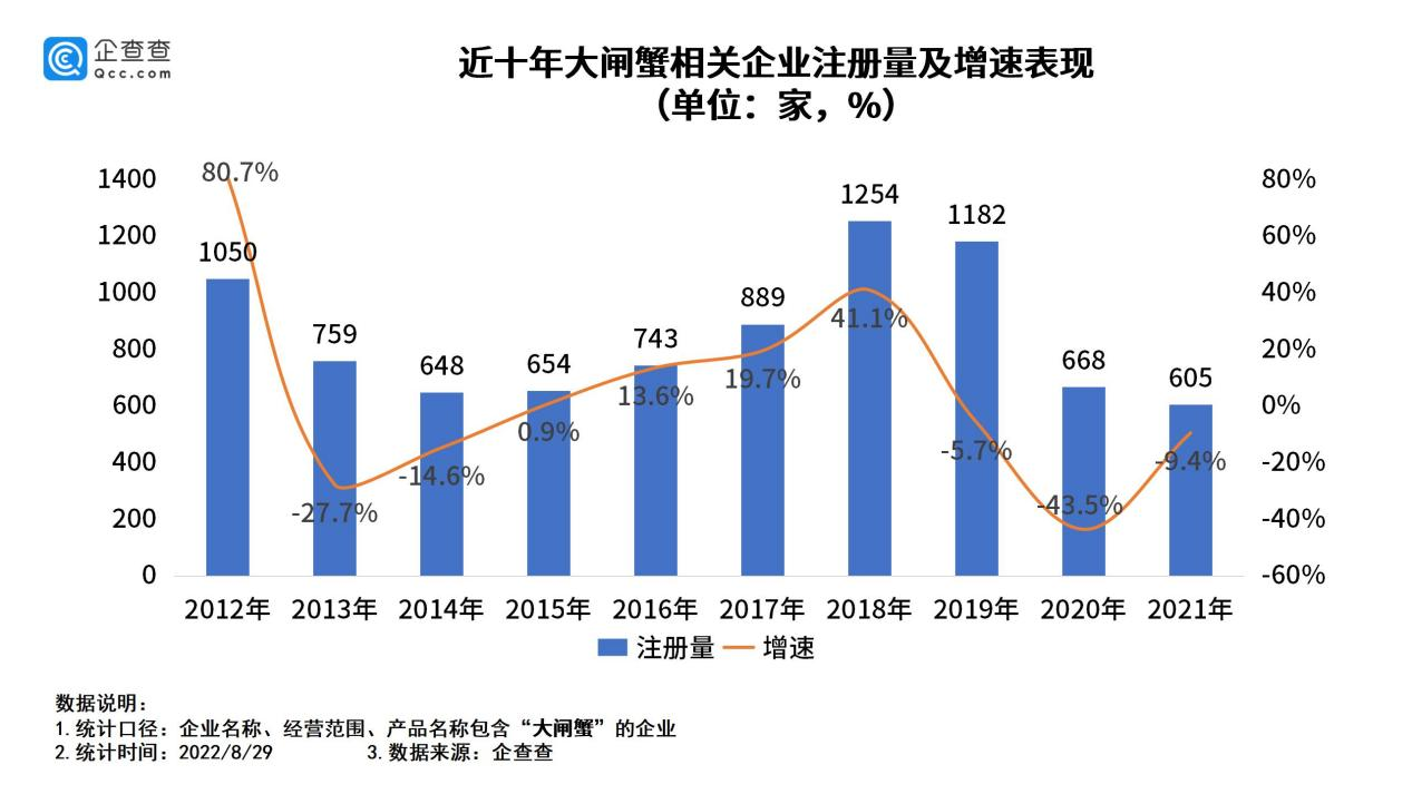 企查查数据显示,我国现存大闸蟹相关企业7769家。2022年上半年,我国新增大闸蟹相关企业111家,同比减少24.5%。具体来看,2012年我国新增大闸蟹相关企业1050家,同比增加80.7%,此后连续五年新增注册量均保持在900家以内;2018年,全年新增大闸蟹相关企业1254家,同比增加41.1%;2019年、2020年、2021年分别同比减少5.7%、43.5%、9.4%至1182家、668家、605家。