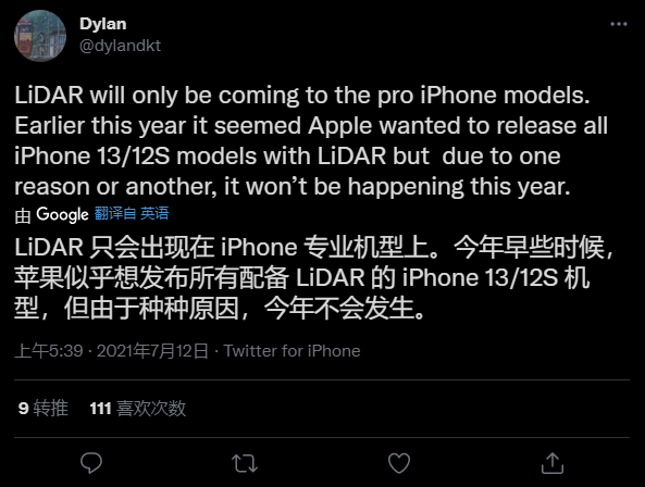 不过,DylanDKT也确认,苹果确实考虑过让iPhone 13全系支持激光雷达扫描仪,只是最后放弃了这个想法。