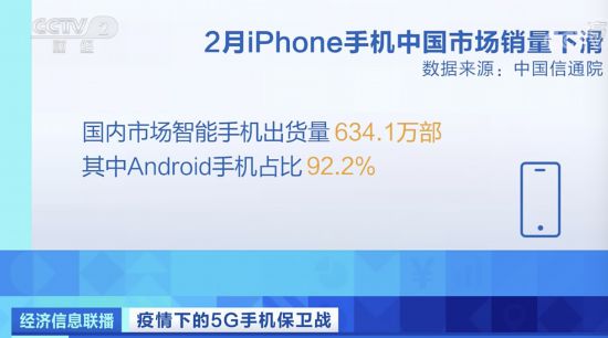 中国信通院发布的数据显示,今年2月份国内市场智能手机出货量为634.1万部,其中Android手机占比92.2%。据此计算,2月份苹果iPhone手机在中国市场只销售了约49.4万部,与去年同期的127万部相比,销量下滑超60%。